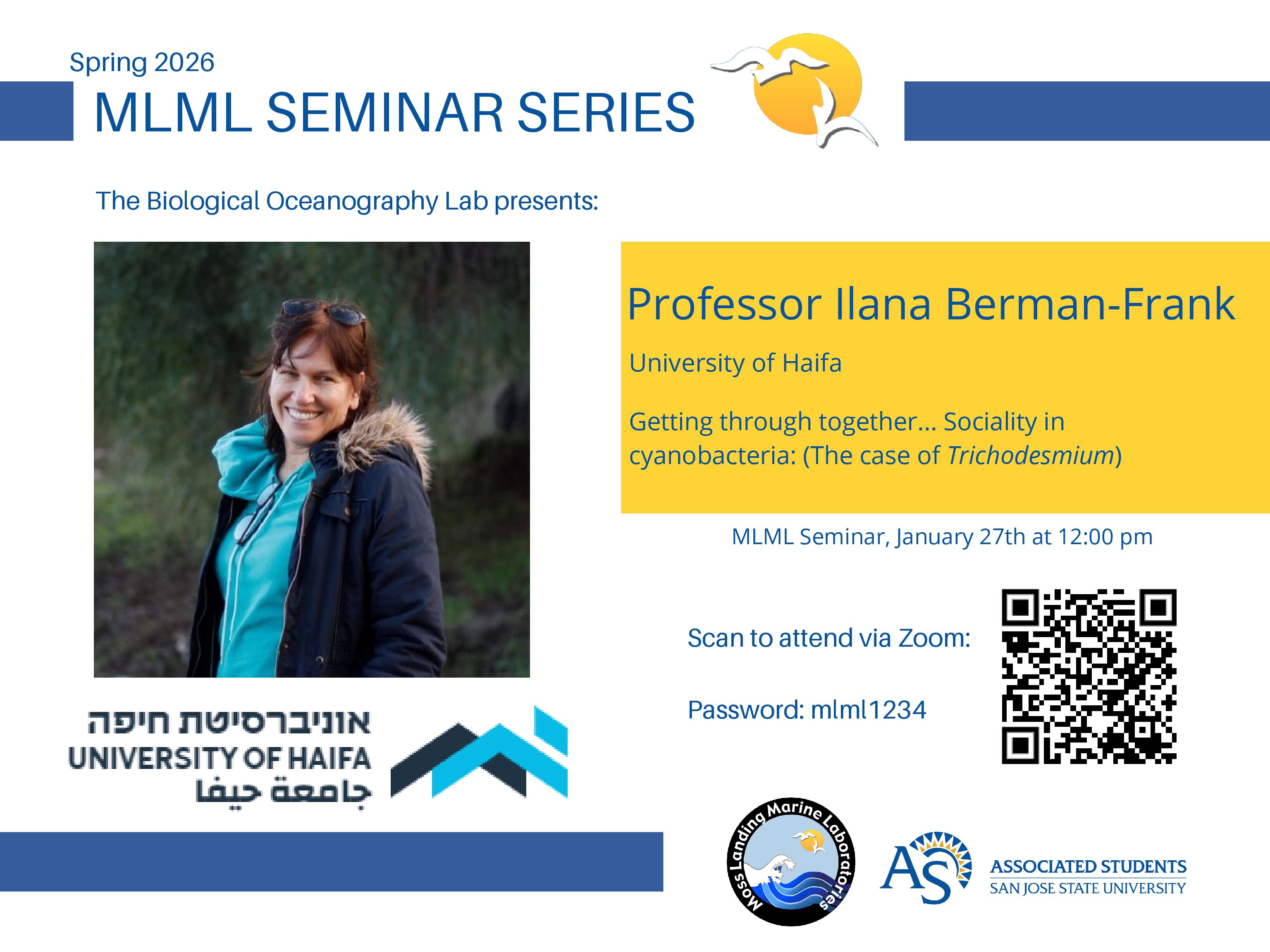 Seminar presented by Dr. Ilana-Berman Frank January 26, 2026January 30, 2026Lauren Bayne "Getting through together… Sociality in cyanobacteria: (The case of Trichodesmium)" January 27th at 12:00 pm
