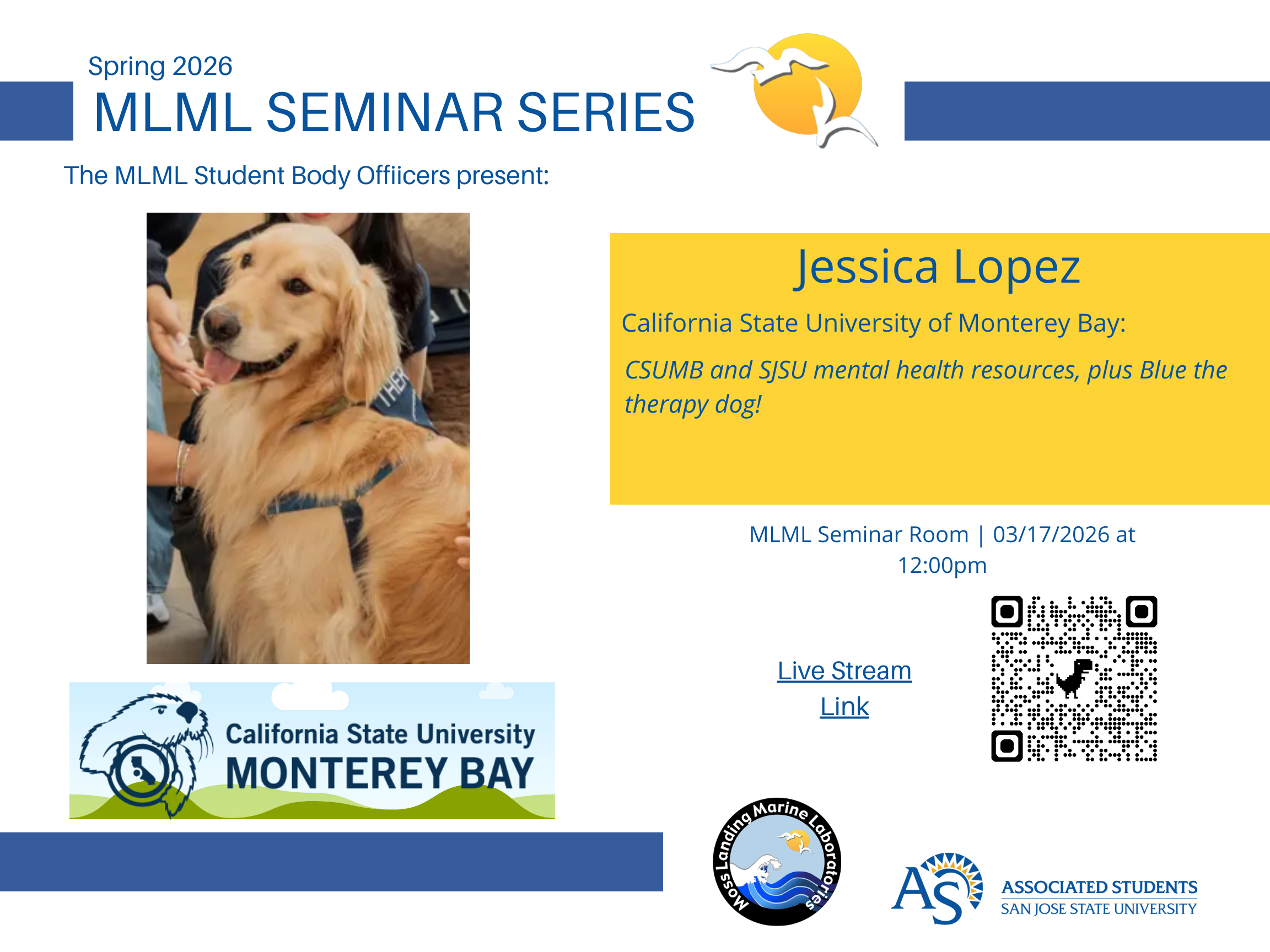 Seminar presented by Jessica Lopez March 13, 2026March 13, 2026Zachary Lanzer Zirbel "CSUMB and SJSU mental health resources, plus Blue the therapy dog!" Tuesday, March 17th, 2026 12:00 - 1:00 pm PST