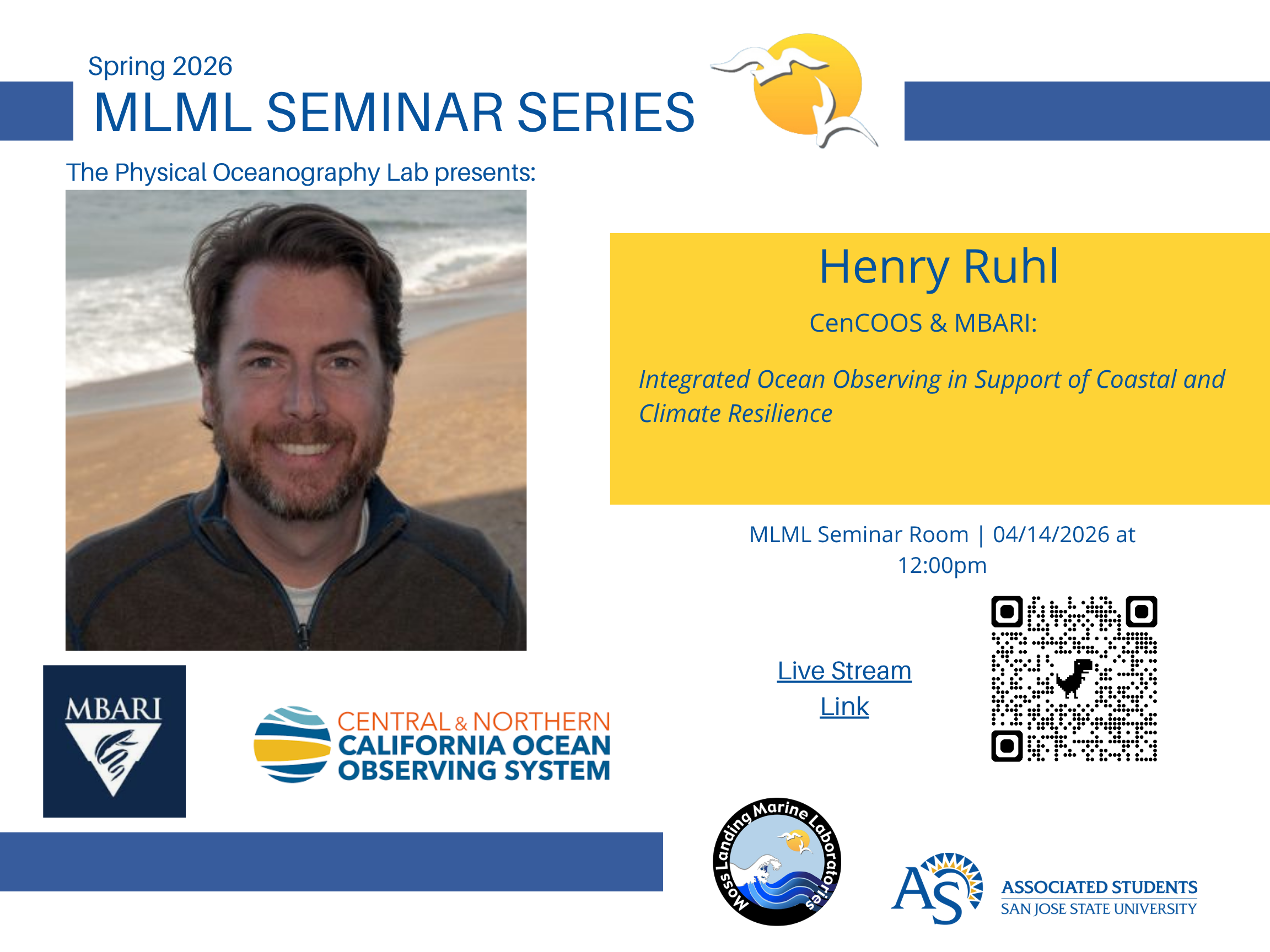 Seminar presented by Henry Ruhl April 10, 2026Zachary Lanzer Zirbel "Integrated Ocean Observing in Support of Coastal and Climate Resilience" Tuesday, April 14th, 2026 12:00 - 1:00 pm PST