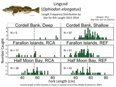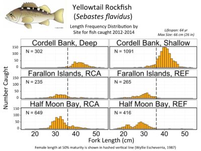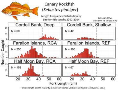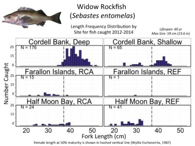 Many species sampled were found to have greater mean lengths inside the Rockfish Conservation Area (RCA) than those fishes sampled outside in the reference areas (REF). However, Rockfish Conservation Areas are deeper than the reference areas, and because many species exhibit ontogenetic (life-history) shifts to deeper water as they age, it is difficult to determine with certainty the cause of mean-length differences. At this point in time, the differences in mean lengths displayed here are attributed to life-history changes, and future analysis will compare current data with historical record to better elucidate differences between the RCA and REF average mean-lengths by species. Shown here are length-frequency distributions for Yellowtail Rockfish, Canary Rockfish, Widow Rockfish, and Lingcod by site collected during 2012-2014.